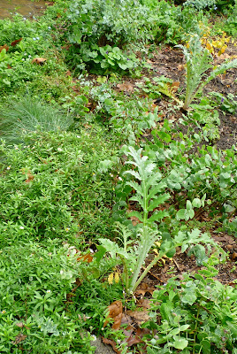 Like E. wildpretti, the Artichokes are biding their time, gathering strength for a big show of growth in autumn. I had them near the Echiums before, but moved them, intertwined them irregularly with Diggers Speedwell (Derwentia perfoliata) to form a rough informal border along a path.